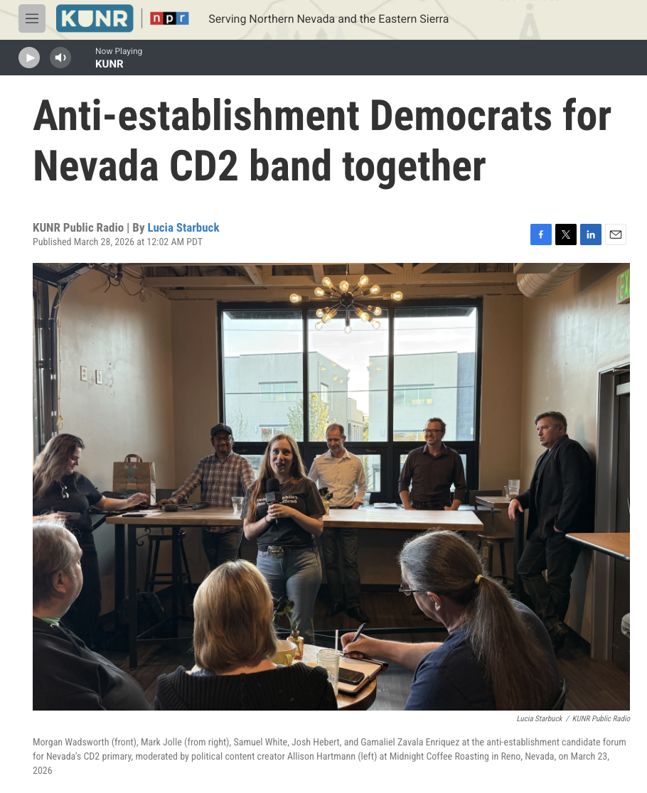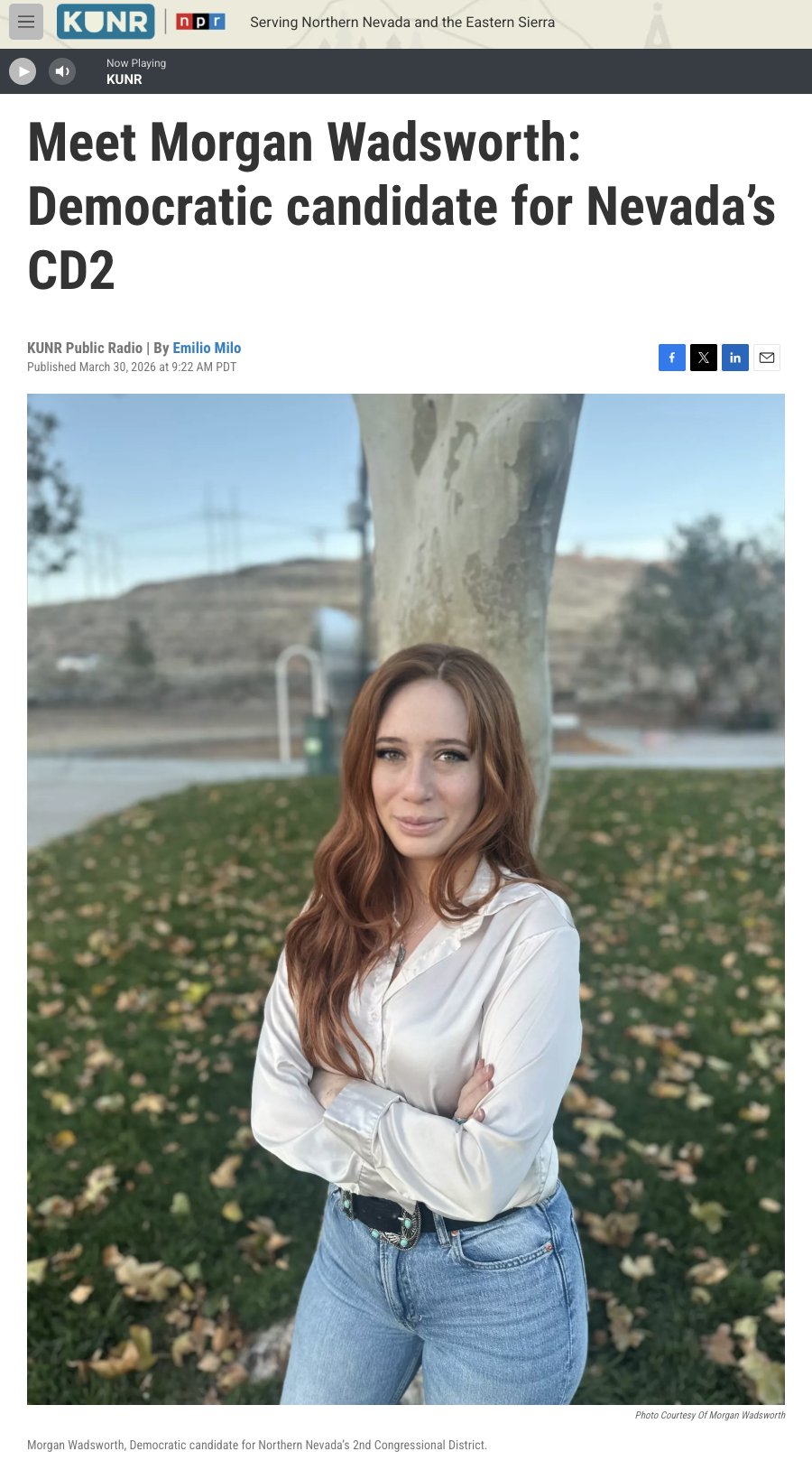 PRESS & MEDIA CLICK HERE FOR MEDIA INQUIRIES Meet Morgan Wadsworth: Democratic candidate for Nevada’s CD2by Emilio Milo, KUNR Public Radio Read Here Anti-establishment Democrats for Nevada CD2 band togetherby Lucia Starbuck, KUNR Public Radio Read Here Morgan Wadsworth: The Gen-Z Student and Former Casino-Worker Vying for Amodei’s Jobby Kelsey Penrose, Carson Now Read Here Morgan Wadsworth, a Gen-Zer Taking on the Establishment to Help Northern Nevada Reach Its Full Potentialby Our Town Reno Read Here TAP HERE FOR MEDIA INQUIRIES